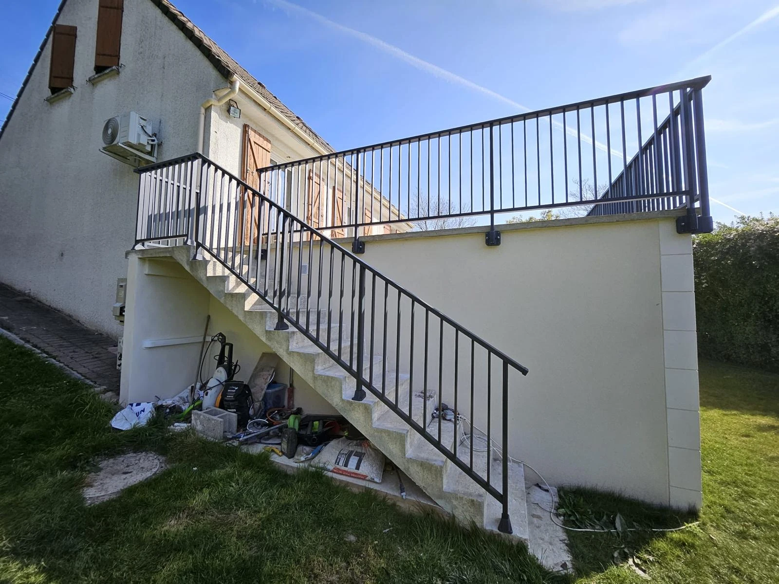 Le garde-corps en aluminium offre une excellente résistance aux intempéries, une grande durabilité et ne nécessite que très peu d’entretien. Pour une harmonie visuelle parfaite, le même modèle de garde-corps a également été installé sur les escaliers, assurant une continuité esthétique et une sécurité optimale.