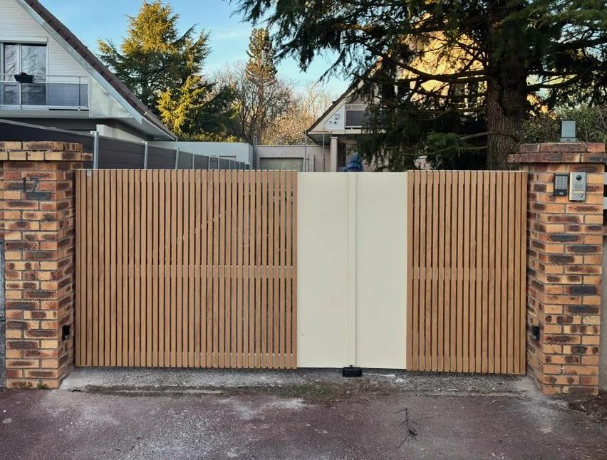 La pose d’un portail aluminium motorisé est une solution idéale pour sécuriser et valoriser l’entrée de votre propriété. Ce portail aluminium design se distingue par son esthétique moderne avec des tasseaux en aluminium imitation bois disposés verticalement, offrant un style élégant type claire-voie tout en conservant la durabilité de l’aluminium.